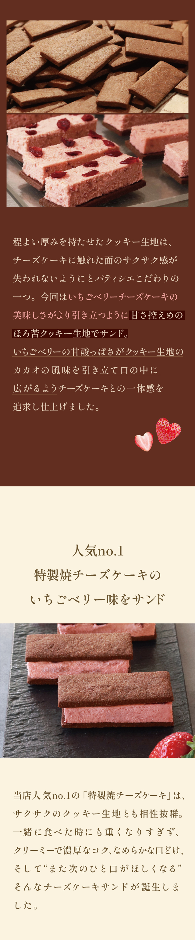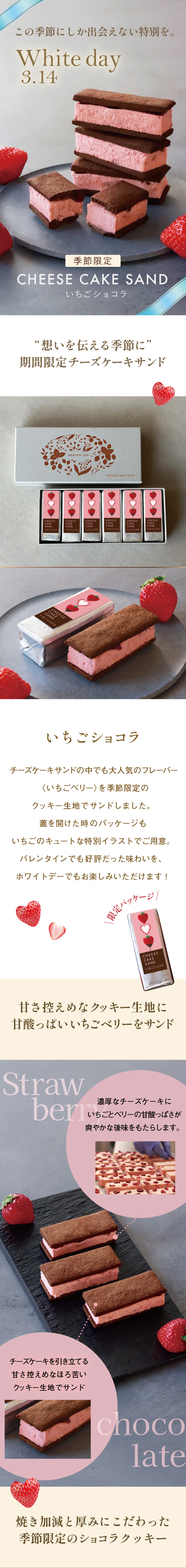 【ホワイトデーにおすすめ!!】 甘酸っぱいいちごベリーチーズケーキをサクサクの ほろ苦クッキー生地でサンドした〈いちごショコラ〉です。